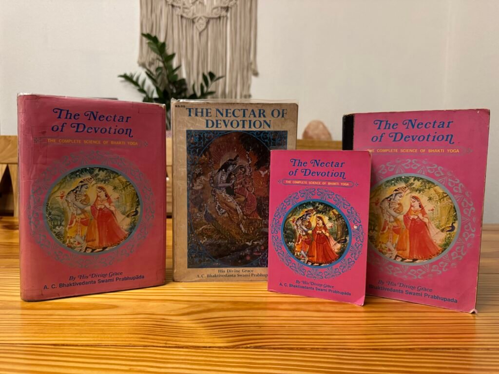Relish the sweetness of the Nectar Of Devotion depicted by the original editions and their cover art. Featuring the classic 1970 white paperback by ISKCON PRESS and the pink-cover 1972 Japan printings.