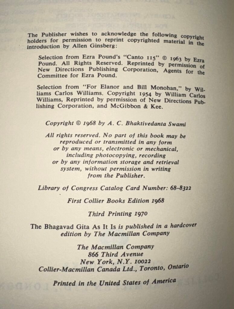 Publisher & Location: The Macmillan Company (New York) / Collier Books.Note: By the 4th printing, the Bhaktivedanta Book Trust (BBT) logo and address (often 3764 Watseka Ave, Los Angeles) began appearing more prominently alongside or in place of Macmillan on the title page.