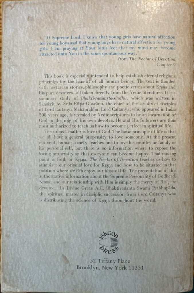 “The Nectar of Devotion is a summary study of Bhakti-rasāmṛta-sindhu, which was written in Sanskrit by Śrīla Rūpa Gosvāmī Prabhupāda. He was the chief of the six Gosvāmīs who were the direct disciples of Lord Caitanya Mahāprabhu. When he first met Lord Caitanya, Śrīla Rūpa Gosvāmī Prabhupāda was engaged as a minister in the Mohammedan government of Bengal. He and his brother Sanātana were then named Sākara Mallik and Dabir Khās respectively, and they held responsible posts as ministers of Nawab Hussain Shah. At that time, five hundred years ago, the Hindu society was very rigid, and if a member of the brāhmaṇa caste accepted the service of a Mohammedan ruler he was at once rejected from brāhmaṇa society. That was the position of the two brothers, Dabir Khās and Sākara Mallik. They belonged to the highly situated sārasvata-brāhmaṇa community, but they were ostracized due to their acceptance of ministerial posts in the government of Hussain Shah. It is the grace of Lord Caitanya that He accepted these two exalted personalities as His disciples and raised them to the position of gosvāmīs, the highest position of brahminical culture. Similarly, Lord Caitanya accepted Haridāsa Thākur as His disciple although he happened to be born of a Mohammedan family, and Lord Caitanya later on made him the ācārya of the chanting of the holy name of the Lord: Hare Kṛṣṇa, Hare Kṛṣṇa, Kṛṣṇa Kṛṣṇa, Hare Hare/ Hare Rāma, Hare Rāma, Rāma Rāma, Hare Hare.” – Taken from the preface to The Nectar Of Devotion by Srila Prabhupada